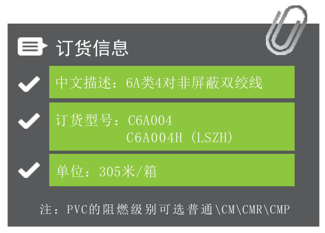 ●最高频率:500MHz ●铜芯规格:4×2×23AWG ●外护套:聚氯乙烯(PVC)/低烟无卤(LSZH) ●线缆外径:6.3±0.5mm ●安装温度:0~50℃ ●工作温度:-20~60℃